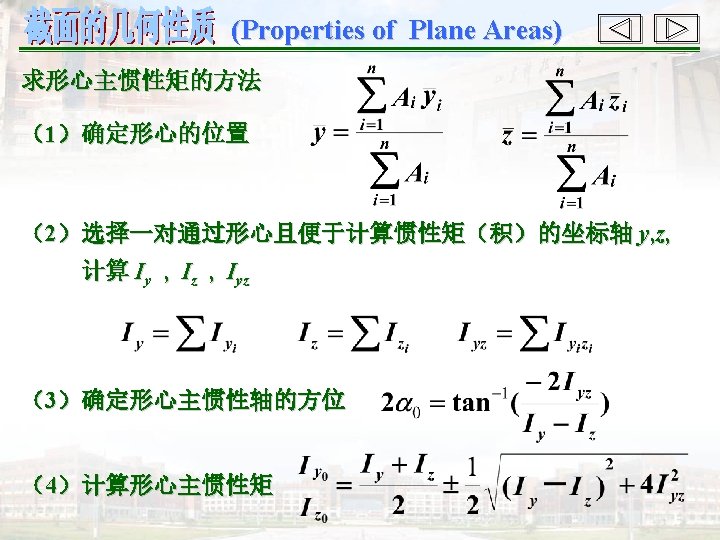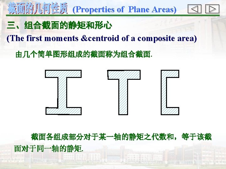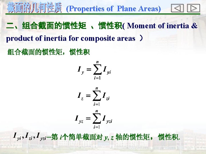 (Properties of Plane Areas) 1. 组合截面静矩(The first moments of a composite area) 其中 Ai —第 i个简单截面面积 —第 i个简单截面的形心坐标 2. 组合截面形心(Centroid of a composite area)