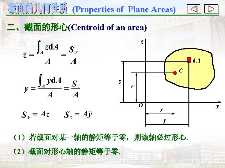 (Properties of Plane Areas) § 1 -1 截面的静矩和形心 (The first moment of the area & centroid of an area) 一、静矩(The first moment of the area ) z 截面对 y , z 轴的静矩为 d. A z 静矩可正,可负,也可能等于零. O y y