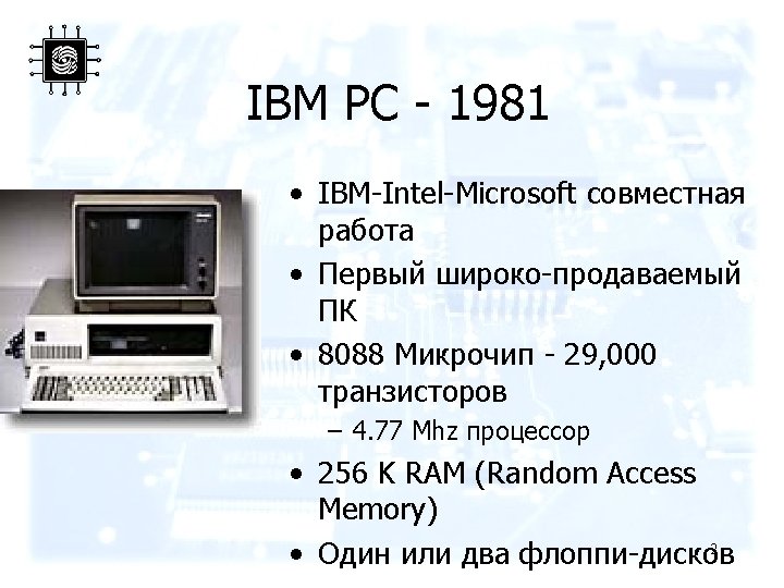 IBM PC • IBM enters small computer market 1981 • Uses open architecture • Purchases operating system from Microsoft