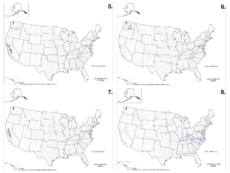 apples canola cattle corn cotton grapes hogs & pigs milk cows peanuts potatoes rice sheep & lambs soybeans sugar beets sunflowers tomatoes vegetables watermelons wheat 8. Source: www. usda. gov/research/atlast 02/index. html