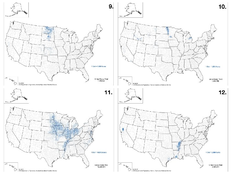 apples canola cattle corn cotton grapes hogs & pigs milk cows peanuts potatoes rice sheep & lambs soybeans sugar beets sunflowers tomatoes vegetables watermelons wheat 9. Source: www. usda. gov/research/atlast 02/index. html