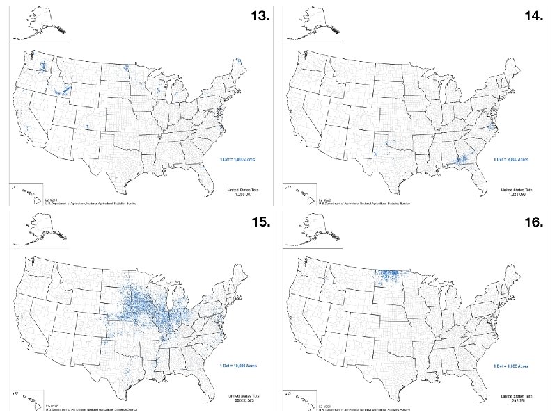 apples canola cattle corn cotton grapes hogs & pigs milk cows peanuts potatoes rice sheep & lambs soybeans sugar beets sunflowers tomatoes vegetables watermelons wheat 15. Source: www. usda. gov/research/atlast 02/index. html