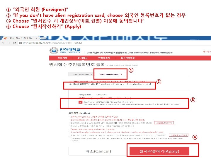 1. Click on ” 2019학년도 2학기 외국인 신편입학 특별전형 원서접수“ 2. Click on ”http: //ipsi 2. uwayapply. com/foreign/inha/? CHA=4” ① ②