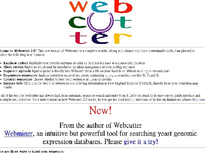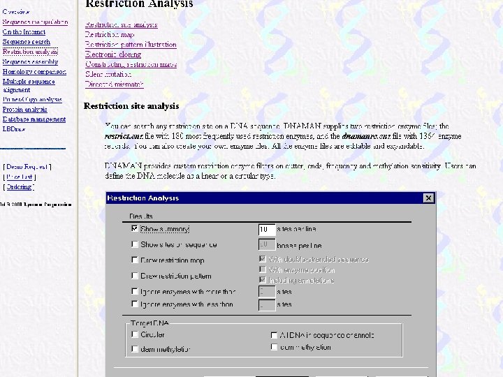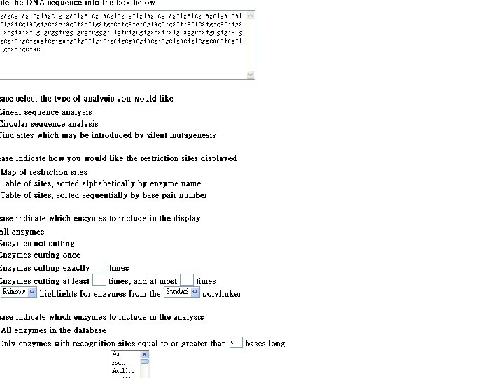 Informatics for Molecular Cloning n n Restriction Enzyme Site Analysis PCR Cloning –primer design Codon Usage Analysis Plasmid Construct – plasmid drawing