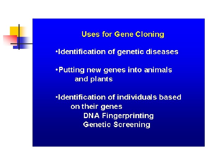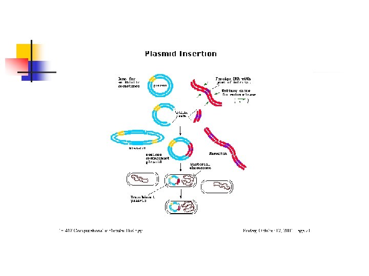 Plasmid Cloning Vector 1. Small 2. Stable in the chosen host – usually E. coli 3. High copy number 4. Easy to purifiy 5. Can accommodate foriegn DNA 6. Single “cloning” sites 7. Selectable marker – antibiotic resistance 8. Easily introduced into host (transformation or transduction