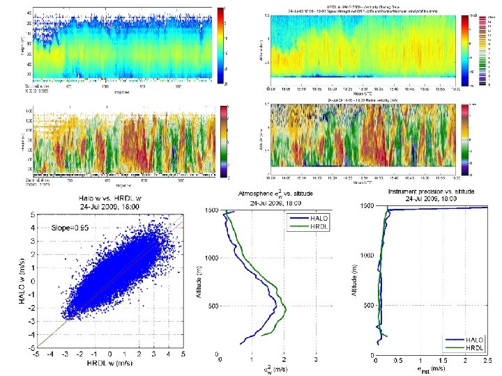 HRDL/Halo Comparison Halo HRDL Detection type coherent Wavelength (µm) 1. 6 2. 0 PRF (Hz) 20 , 000 200 Pulse Energy µJ m. J Aperture (cm) 7. 5 10 Range gate (m) variable 30 • Operated for nearly 24 hours • Two modes: vertically and nearly horizontally pointing • Compare instantaneous velocity measurements with same averaging time (~1 -2 s)