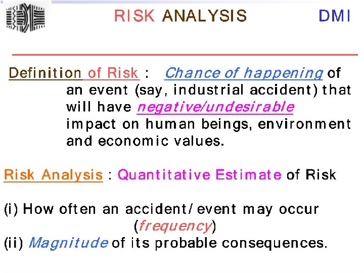 Infrastructures required for Consequence/Risk Analysis DMI . Complete Inventory of hazardous processes, chemicals, details of storage (T, P, type of vessel etc. ) etc. . Expert professionals having thorough understanding of the process thermodynamics and atmospheric dispersion. . Meteorological data and knowledge of stability classes. . Relevant Software to predict vulnerable zones