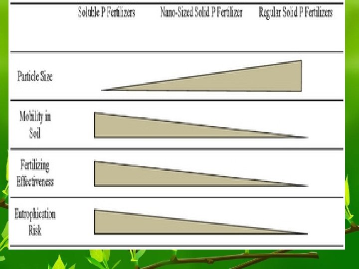 • Since fertilizers are the main concern, • developing nano based fertilizer would be a new technology in this field. Fertilizers are sprayed in many ways either to soil or through leaves, even to aquatic environments; these inorganic fertilizers are supplied in order to provide three main components, nitrogen, phosphorous and potassium in equal ratios