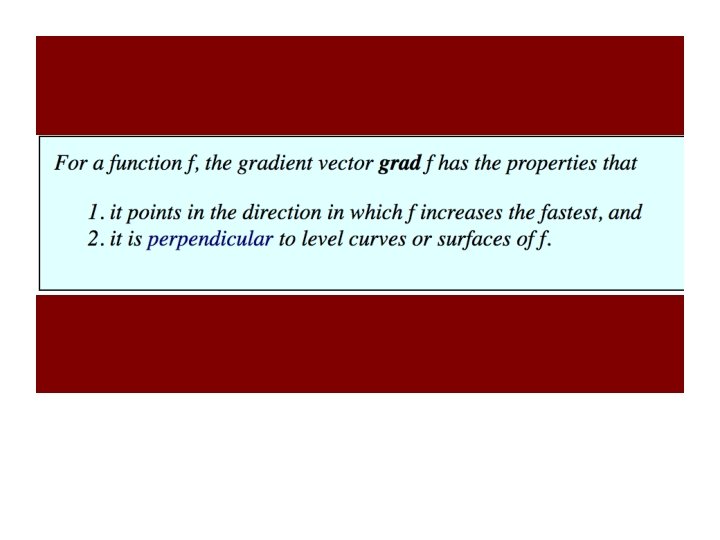 • Suppose f is a differentiable function of two or three variables. • The maximum value of the directional derivative Duf(x) is: – It occurs when u has the same direction as the gradient vector