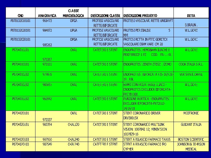CND DESCRIZIONE J 01 DISPOSITIVI PER FUNZIONALITA' CARDIACA P 07 PROTESI VASCOLARI E CARDIACHE C 01 DISPOSITIVI PER SISTEMA ARTERO-VENOSO P 09 PROTESI ORTOPEDICHE E MEZZI DI OSTEOSINTESI H 01 SUTURE CHIRURGICHE H 02 QUANTITA' GENN GIU 2006 IMPORTO GENN GIU 2006 % 606 1. 589. 054 9, 84 1. 227 1. 269. 430 7, 86 177. 074 1. 265. 255 7, 84 6. 488 1. 153. 967 7, 15 19. 154 964. 414 5, 97 SUTURATRICI MECCANICHE 6. 049 874. 336 5, 41 Z 02 APPARECCHIATURE PER ESPLORAZIONI FUNZIONALI ED INTERVENTO TERAPEUTICO 8. 399 657. 121 4, 07 F 01 FILTRI PER DIALISI 14. 507 557. 827 3, 45 A 03 APPARATI TUBOLARI 365. 938 535. 979 3, 32 M 04 MEDICAZIONI SPECIALI 53. 681 438. 621 2, 72 K 01 CHIRURGIA MINI-INVASIVA 6. 294 342. 759 2, 12 M 02 GARZE DI COTONE E TNT 1. 035. 892 317. 061 1, 96 totale 1. 695. 309 9. 965. 824 61, 72 ALTRI GRUPPI 11. 230. 304 6. 181. 098 38, 28 TOTALE COMPLESSIVO 12. 925. 613 16. 146. 922 100, 00