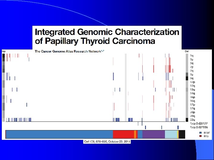 PTC distribution according to TNM stages and the presence/absence of a genetic alteration Thyroid cancers TNM staging Genetic alteration Total (AJCC/UICC ) positive negative I 28 19 47 II 0 0 0 III 13 6 19 IV 6 0 6 Total 47 25 72 Rossi …. Zatelii Thyroid. 2015; 25: 221 -8