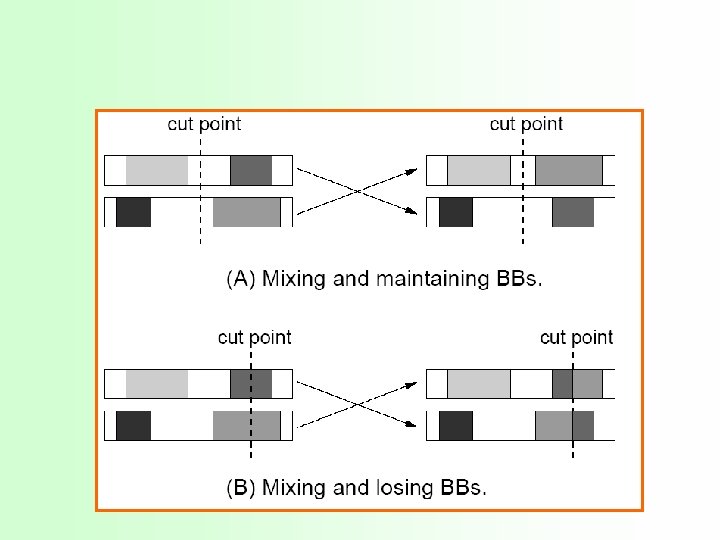 Recombination • Select a cut point, parts AAAAAA • cut at bit 2 AA AAAA • exchange parts AA 1111 cut two parents, exchange 111111 11 11 AAAA