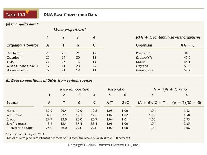 Erwin Chargaff • 1949 -1953 • Digested many DNAs and subjected products to chromatographic separation • Results – A = T, C = G – A + G = C + T (purine = pyrimidine) – A + T does not equal C + G • Members of a species similar but different species vary in AT/CG ratio