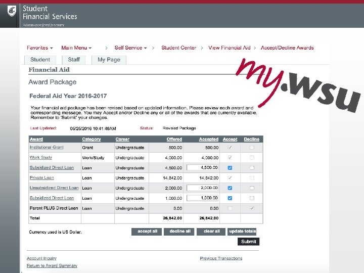 Next Steps: Federal Direct Loans • View in my. WSU • Accept – Choose desired amount – Can get the rest later or use for summer • Complete the tasks! – First time borrowers – Should show up on aid year checklist ü MPN and Entrance Counseling • Can take 2 to 5 days, depending on processes – Does not happen in "real time"