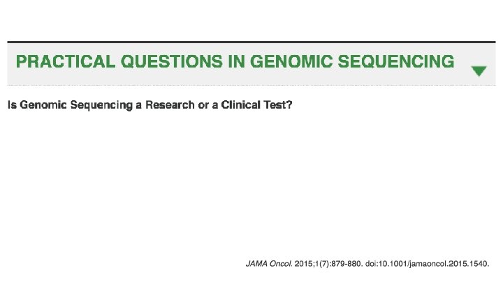 How to document and define the value of genomic profiling in cancer? • What sort of profiling? – Single gene testing – “Limited” panel testing vs. “large” panel testing – Whole exome? Whole genome? • What defines “actionability”? – Results may be interesting – but do they drive important changes in patient management?