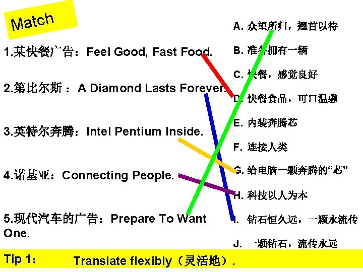 Tip 2: Understand the advertising slogan properly. s e c i o h c e l p i t Mul 1. We Do Chicken Right –KFC A. 我们有做鸡的权利 B. 我们只做鸡的右半边 C. 我们肯定是鸡 D. 向右看! 有鸡! E. 我们是烹鸡大师 F. 做鸡有理! ☆ 2. 白翎钢笔,无可比拟 胆小鬼 A.White Fur, Is The Best. B. White Feather, Beyond Comparison. C. Bailing, Beyond Comparison ☆