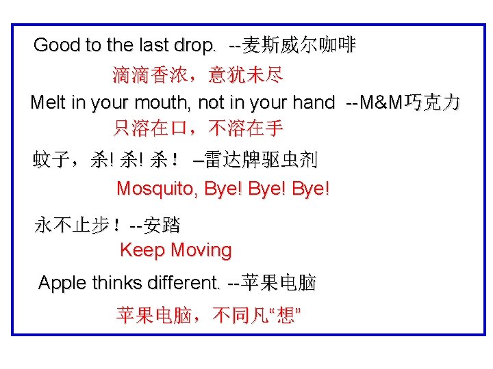 k r o w l a u d i v i d n I 1. Good to the last drop. --麦斯威尔咖啡 2. Melt in your mouth, not in your hand --M&M巧克力 3. 蚊子,杀! 杀! 杀! –雷达牌驱虫剂 4. 永不止步!--安踏 5. Apple thinks different. --苹果电脑