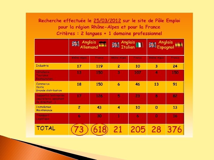 L'allemand est un atout précieux pour la vie professionnelle. L'allemand est la langue la plus parlée en Europe (22% de la population). 2200 entreprises allemandes implantées en France, 2700 entreprises l'Allemagne est le premier partenaire économique de la France. françaises en Allemagne : L'allemand est la deuxième langue utilisée en France à l'exportation. Selon Pôle Emploi, l'allemand est la deuxième langue la plus demandée après l'anglais à l'embauche. → Vus les nombreux partenariats entre la France et l'Allemagne, apprendre l'allemand, c'est s'ouvrir de nombreuses possibilités de travaux d'été, d'études à l'étranger. . .