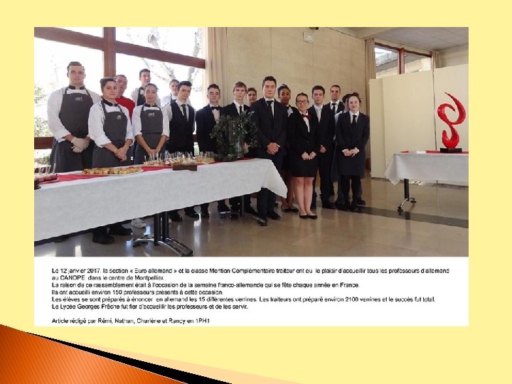 L'allemand comme une compétence professionnelle ! Depuis la rentrée 2014, une section expérimentale a été ouverte dans le domaine de l'hôtellerie au lycée Georges-Frêche à Montpellier, en partenariat avec le Land de Brême. Elle s'adresse à toute une classe de 2 nde bac pro cuisine et service, et vise à dynamiser un groupe, en utilisant l'apprentissage d'une langue nouvelle comme moyen d’accompagner la professionnalisation des élèves.
