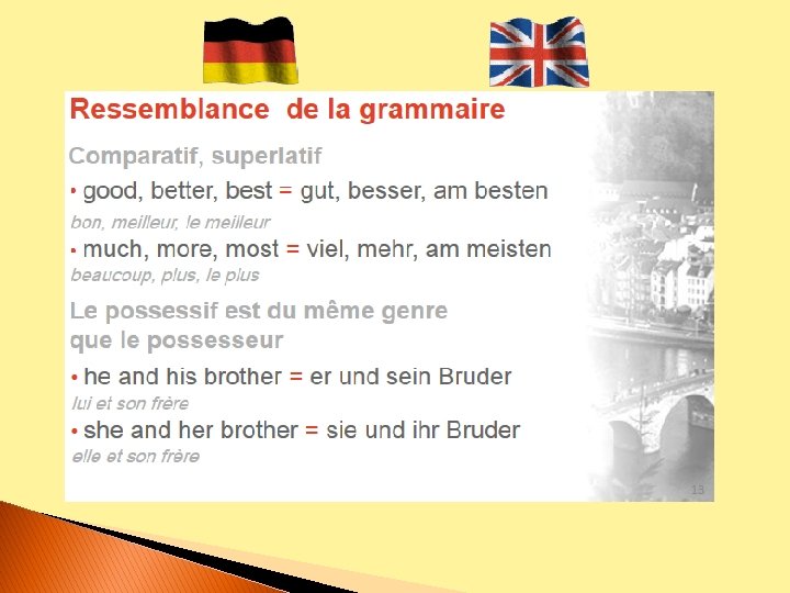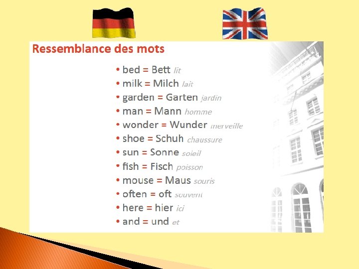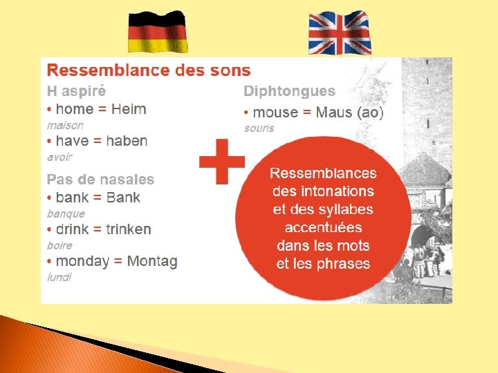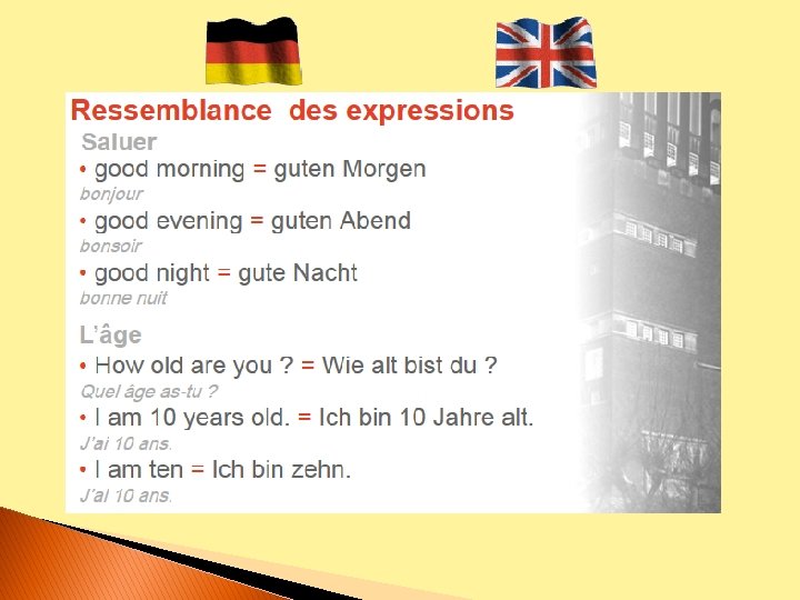 L’allemand et l’anglais sont des langues d’origine anglo-saxonne. Il existe beaucoup de similitudes entre les deux: • dans le vocabulaire (mots anglais d’origine germanique, mots allemands empruntés à l’anglais) • dans de nombreux verbes • dans de nombreuses structures (syntaxe) • dans la prononciation ou les intonations de mots ou de phrases • dans de nombreuses constructions grammaticales • dans de nombreuses expressions (salutations, âge …)