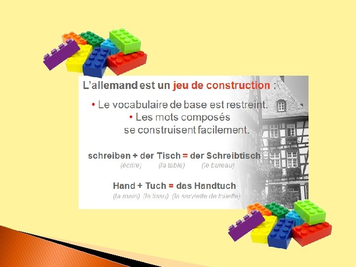 L’allemand est une langue difficile et donc réservée aux bons élèves … L'allemand a cette réputation mais TOUTES les langues ont leurs difficultés, elles ne portent tout simplement pas sur les mêmes points et n’apparaissent pas au même moment de l’apprentissage. L’allemand peut paraître au contraire pour certains plus facile par la clarté de ses règles et sa logique. Beaucoup y voit un jeu de construction, un peu comme les légos, permettant d’associer des mots pour en créer d’autres.