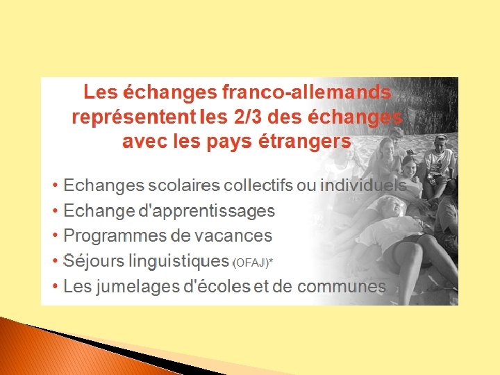 et un ensemble incomparable de structures… • OFAJ ( Office Franco-Allemand pour la Jeunesse) permet le financement des échanges scolaires ou privés • Programme Brigitte Sauzay propose un séjour de trois mois en Allemagne (de la 4° à la 1ère) • Programme Voltaire propose un séjour de six mois en Allemagne (en 2 nde) • Programme Erasmus dans le cadre d’échanges entre universités • Fondation Alexander von Humbolt (bourses d’études)