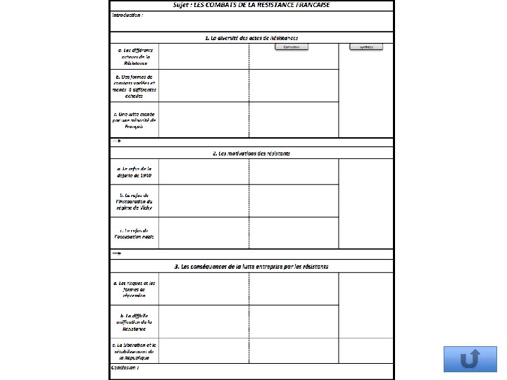 Etude d’un mouvement de résistance pour comprendre l’expérience de guerre de combattants civils et leurs motivations politiques et idéologiques Expériences concrètes de combattants civils Etude d’un mouvement de résistance Motivations politiques, idéologiques, de ce réseau Appréhender les actes, les formes et des acteurs de la Résistance La Résistance active et organisée, qui reste un choix minoritaire Montrer les conséquences de la défaite, de l’occupation et de la collaboration Une lutte violente et sans répit pour la Libération du territoire et la restauration de la République Caractériser le Régime de Vichy Les fondements politiques et idéologiques de la Résistance (valeurs de la République, CNR)