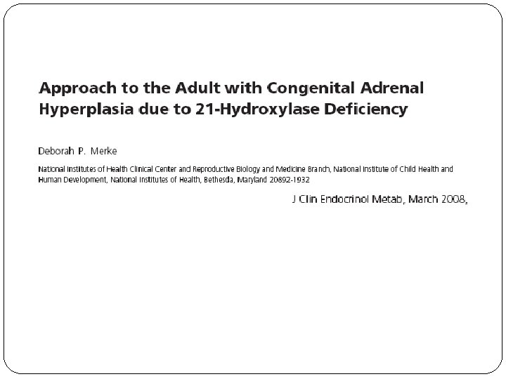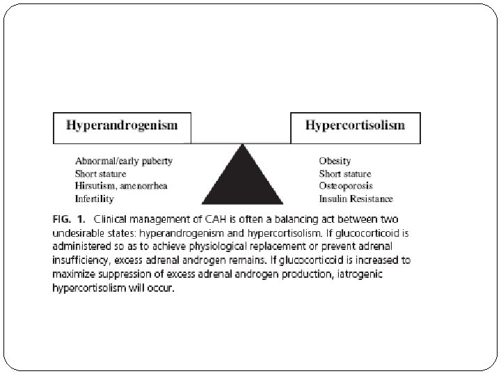 Bone Mineral Density (BMD) � Glucocorticoid overtreatment has been implicated as the cause of decreased BMD in multiple studies � These studies provide compelling evidence that the lowest possible glucocorticoid dose should be used in the treatment of CAH, and lower-dose and/or shorter-acting glucocorticoid may be sufficient in the middle-aged and elderly female when osteoporosis rather than fertility is a main concern. � Osteoporosis prophylaxis such as physical activity and calcium and vitamin D supplementation should be implemented at a young age. Screening dual-energy x-ray absorptiometry (DXA) should be