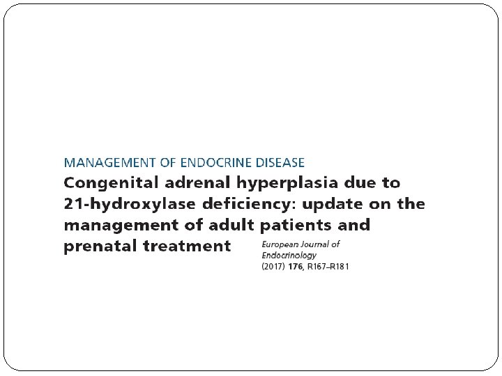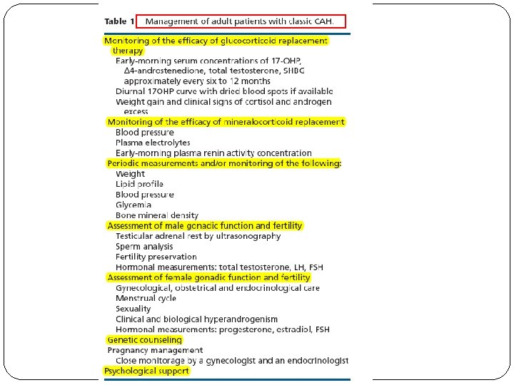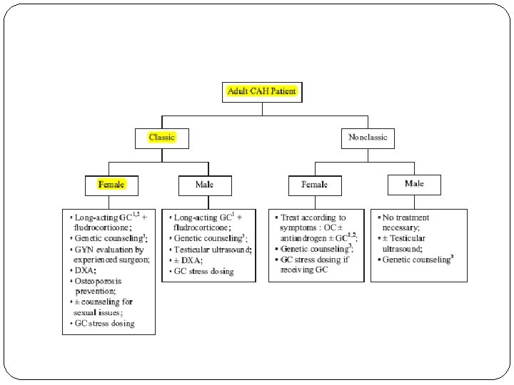 Imaging � Most sources recommend annual testicular sonography in males with 21 OHD to screen for TARTs � Recommendations for adrenal imaging and for bone densitometry have not been established. � Adrenal Imaging should be considered for patients with a long history of poor control, inconsistent therapy, or difficult-tocontrol disease � dual-photon x-ray absorptiometry should be considered for patients taking chronic dexamethasone 0. 5 mg/d or higher,