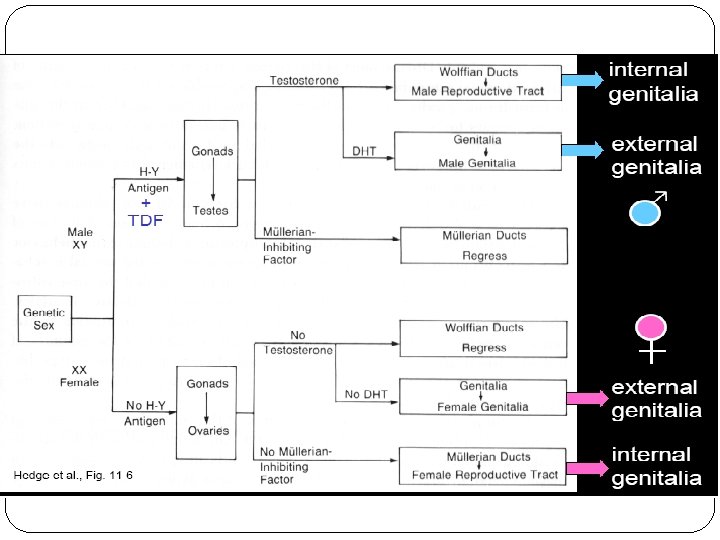 Sex Differentiation �Presence of Y chromosome induces differentiation of bipotential gonads to testes at 6 -8 wks gestation. �Remaining internal and external genitalia are also bipotential. �Hormonal regulation �Dihydrotestosterone (DHT) �Testosterone
