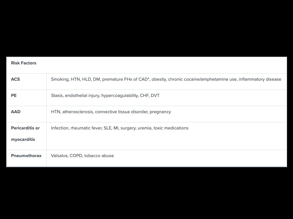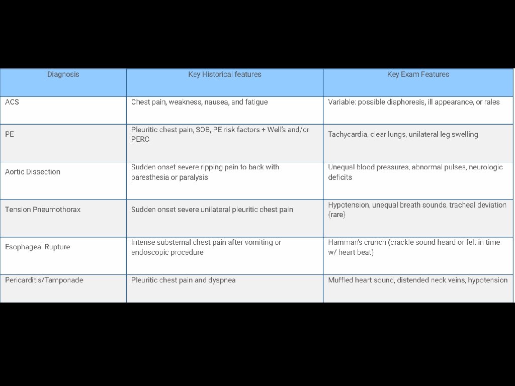 Life Threatening Causes of Chest Pain Acute Coronary Syndrome (ACS) Acute Aortic Dissection (AAD) Pulmonary Embolism (PE) Cardiac Tamponade Esophageal Rupture Tension Pneumothorax