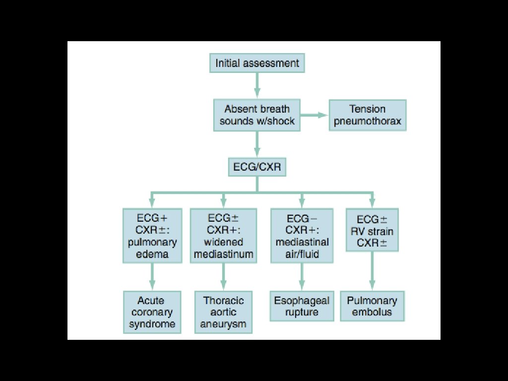 Diagnosis: • ECG mostly non specific or may show a STEMI as a result of dissection of coronary ostia. • CXR may shows widened mediastinum (61%) or abnormal aortic contour (50%). • Normal x-ray does not rule out the diagnosis. • CTA is the test of choice.
