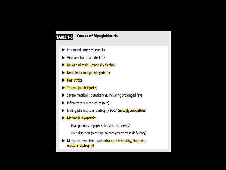 8. Myoglobinuria – – – uncommon manifestation of muscle disease caused by the excessive release of myoglobin from muscle during periods of rapid muscle destruction (rhabdomyolysis). Severe myoglobinuria can result in renal failure due to acute tubular necrosis. If patients complain of exercise-induced weakness and myalgias, they should be asked if their urine has ever turned cola-colored or red during or after these episodes. Recurrent myoglobinuria is usually due to an underlying metabolic myopathy isolated episodes, particularly occurring after unaccustomed strenuous exercise, are frequently idiopathic.