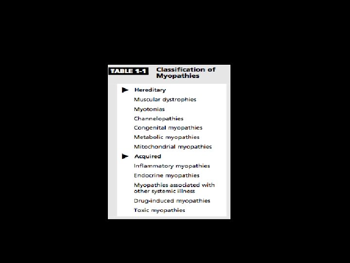 Myopathies Presenting at Birth • • Congenital myotonic dystrophy Centronuclear (myotubular) myopathy Congenital fiber-type disproportion Central core disease Nemaline (rod) myopathy Congenital muscular dystrophy Lipid storage diseases (carnitine deficiency) Glycogen storage diseases (acid maltase and phosphorylase deficiencies)