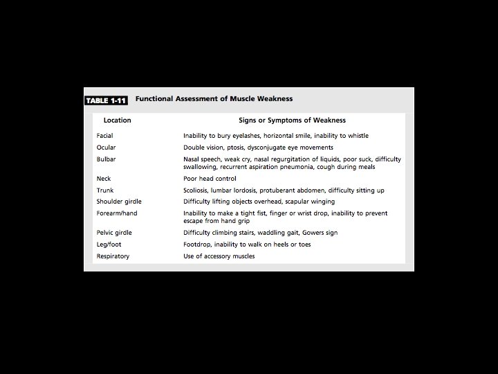 1. Weakness: a) Proximal lower extremities: • difficulty climbing stairs, arising from a low chair or toilet, or getting up from a squatted position. b) Proximal upper extremities: • trouble lifting objects over their head and brushing their hair. c) Distal upper extremities: • difficulty opening jars, inability to turn a key in the ignition. d) Distal lower extremities: • tripping due to footdrop. e) Cranial muscle weakness, • dysarthria, dysphagia, or ptosis.