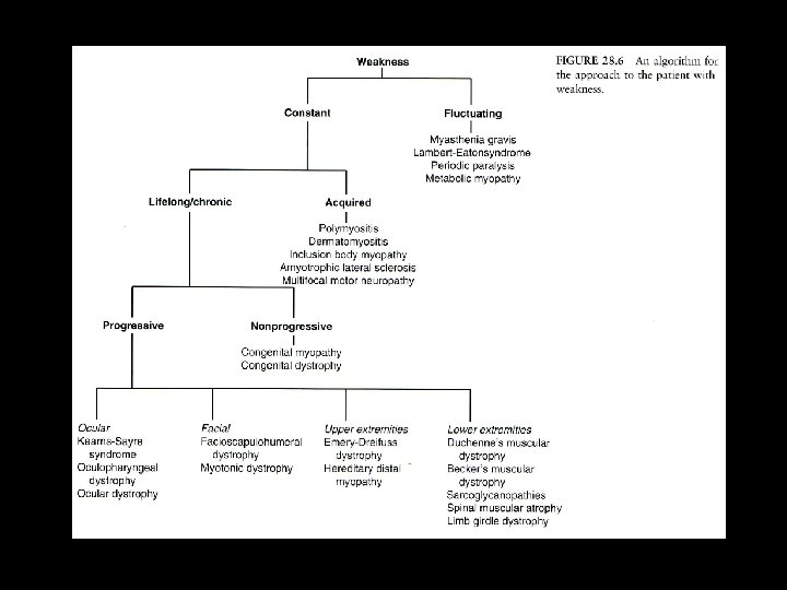 Constant weakness • acute or subacute progression – inflammatory myopathies (dermatomyositis and polymyositis); • chronic slow progression over years – most muscular dystrophies – IBM • nonprogressive weakness with little change over decades – congenital myopathies