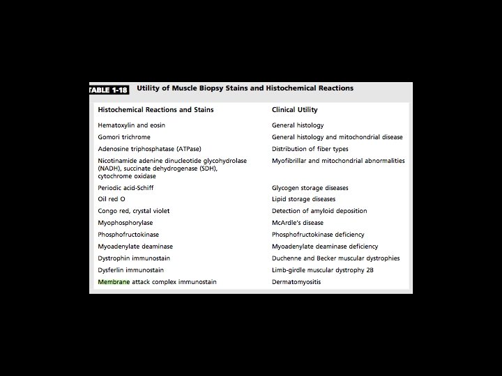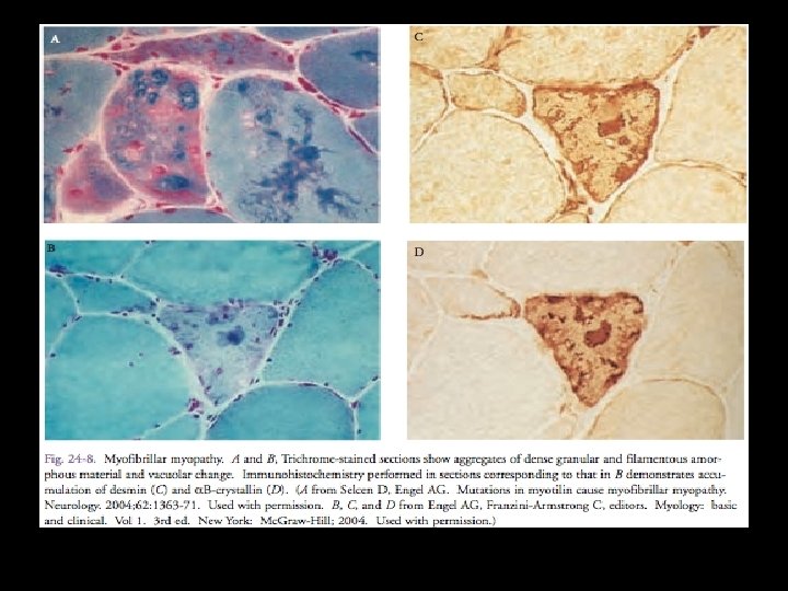 IBM • endomysial inflammation with invasion of non-necrotic muscle fibers • small groups of atrophic fibers, • eosinophilic cytoplasmic inclusions, and muscle fibers with one or more rimmed vacuoles lined with granular material • Amyloid deposition is evident on Congo red staining. • TDP-43 positive • Ubiquitin positive • Electron microscopy demonstrates 15 -nm to 21 -nm cytoplasmic and intranuclear tubulofilaments
