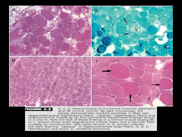 • W • Increased variability in muscle fiber size • degeneration, regeneration, isolated ‘‘opaque’’ hypertrophic fibers, and significant replacement of muscle by fat and connective tissue. • Central nuclei are present in 2% to 4% of the fibers. • Type 1 fiber predominance is seen in most patients. • Inflammatory cell infiltrates in the perimysium, endomysium, and perivascular spaces and consist mostly of mononuclear cells, especially macrophages. • endomysial and perimysial fibrosis with disease progression