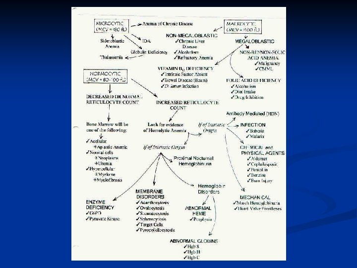 Conclusions Anemia is a clinical finding, not a diagnosis and requires some investigation to determine the underlying etiology. n Iron deficiency anemia in men or postmenopausal women is primarily a result of gastrointestinal blood losses; therefore, finding iron deficiency anemia in this patient population warrants a through GI workup. n Iron deficiency anemia in women of reproductive age is most often caused by n