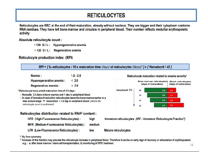 Reticulocyte count: Prominant role in initially classifying any anemia The normal count is 0. 5 -2. 0 % Absolute count 25 -75 x 10 -9/L Absolute reticulocyte percentage; (%reticulocytes) x (patient htc/45) Absolute reticulocyte count; (%reticulocytes) x (red blood cell count)