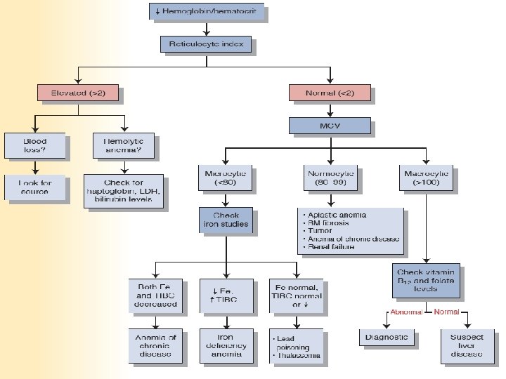 Hb < 12 g/d. L CBC Reticulocyte Index MCV: Reticulocyte index: Normocytic <2 Hypoproliferatif (low production) Macrocytic Microcytic <2 Maturation disorders (ineffective) Normocytic > 3 -5 Hemolysis (high production)