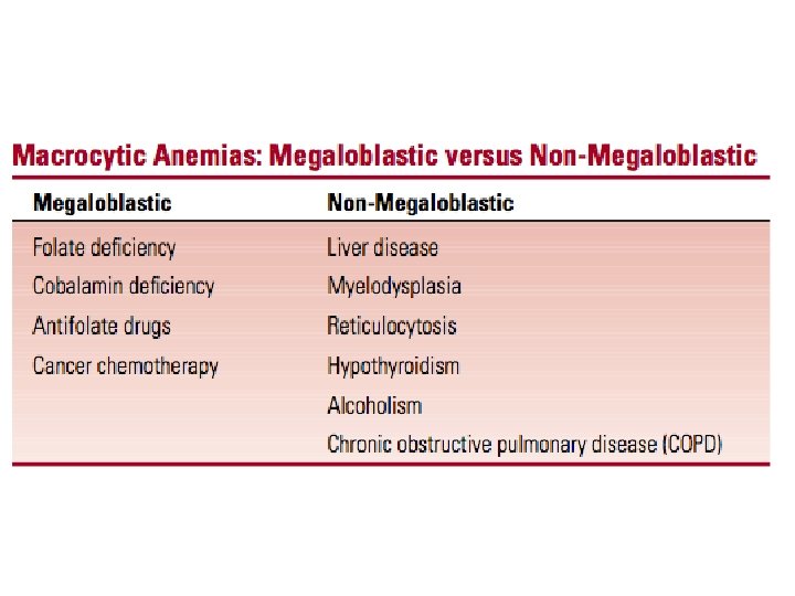 MICROCYTIC NORMOCYTIC MACROCYTIC MCV < 85 f. L MCV 80 -95 f. L MCV > 95 f. L Iron deficiency anemia Early iron deficiency Megaloblastic anemias Vitamin B 12 deficiency Folate deficiency Thallassemia Anemia of renal insufficiency Alchol or tobacco abuse Anemia of Chronic disease Temporal arteritis Rheumatoid Arthiritis Chronic Osteomiyelitis Anemia of Chronic disease Liver disease Hypothyroidism Sideroblastic anemia Hemolytic anemias Acute hemolytic anemia Hodgkin Disease Non thalassemic hb-pathies Intoxications (Pb, Cu) Aplastic anemia Drug induced Bone marrow supression Drug effects (Hydroxyurea) Bone Marrow infiltration Metatstatic cancer Hematologic malignancies Myelofibrosis Myelodysplastic syndrome