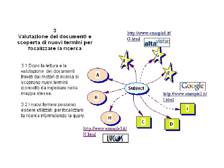Alcuni commenti • Ogni obiettivo di ricerca di informazione è in realtà un “obiettivo cognitivo” • Raggiungere l’obiettivo cognitivo richiede di – partire da una base di conoscenza (“previous knowledge” – raggiungere (ricercando, analizzando, e apprendendo) elementi cognitivi che si avvicinano sempre più all’obiettivo – valutare passo per passo quanto vicini si ritiene di essere all’obiettivo • Le mappe concettuali permettono di rappresentare informazione articolata e complessa per trasformarla in “conoscenza”