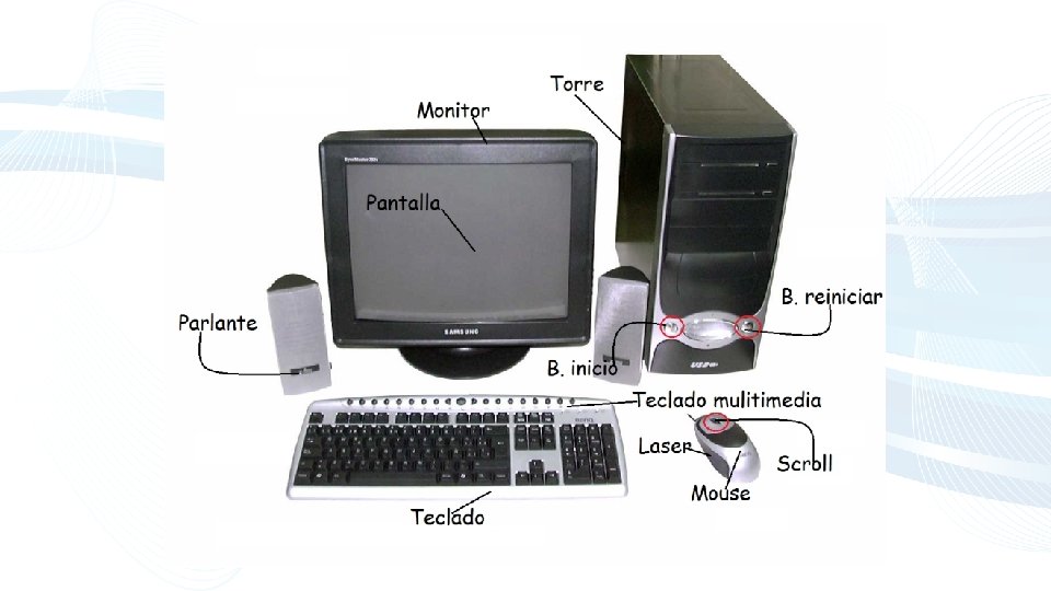 ¿ Qué partes tiene el computador? • Se compone de dos partes principales: • HARDWARE o partes duras que son las partes que puedes tocar del computador como el monitos, el teclado, mouse, etc. • SOFTWARE o parte blandas que es lo que no puedes tocar de la computadora aunque si las usas y son los programas, instrucciones, datos, etc.
