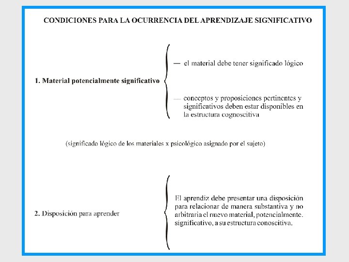 Determinación de la estructura conceptual de lo que va a ser enseñado Identificación de los subsumidores relevantes Organización del contenido, teniendo en cuenta su estructura conceptual, el uso de los organizadores avanzados, la diferenciación progresiva, la reconciliación integrativa y las relaciones naturales de dependencia entre los tópicos. Averiguación de la estructura cognitiva del alumno Instrucción complemental, si necesaria Enseñanza, teniendo en cuenta la estructura cognoscitiva del alumno, la consolidación y el uso de estrategias y métodos instruccionales que faciliten el aprendizaje significativo de la estructura conceptual de la materia de enseñanza. Aprendizaje significativo; crecimiento cognoscitivo del alumno Evaluación del aprendizaje y de la instrucción realimentación Un modelo para organizar la instrucción de acuerdo con la teoría de Ausubel. (M. A. Moreira)