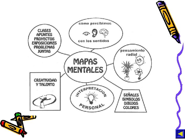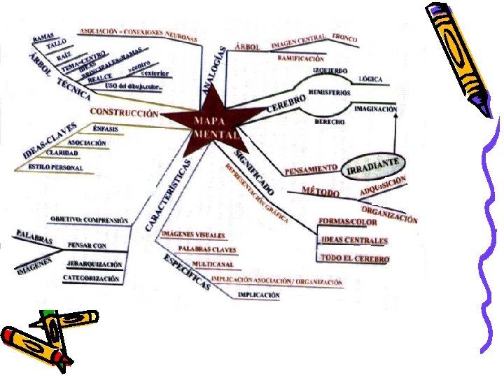 Mapas mentales El mapa mental tiene 4 características esenciales: A) El asunto motivo de atención se cristaliza en una imagen central B) Los principales apartados se irradian de la imagen central de forma ramificada C) Las ramas comprenden una imagen o una palabra clave impresa sobre una línea asociada. Los puntos de menor importan-cia también están representados como ramas adheridas a las ramas de nivel superior D) Las ramas forman una estructura nodal conectada.