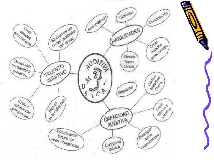 Tipos • 1. Inteligencia auditiva-musical. Los niños que la muestran se sienten atraídos por los sonidos de la naturaleza y por todo tipo de melodías. Disfrutan siguiendo el compás de la música con el pie, golpeando o sacudiendo algún objeto rítmicamente. Son hábiles en el canto, en la ejecución de instrumentos y en la apreciación musical. • 2. Inteligencia corporal-kinestésica. Se aprecia en los niños que usan su cuerpo para expresar emociones como danza y expresión corporal; que se destacan en actividades deportivas, y en trabajos de construcción donde se utilizan materiales concretos. También en aquellos que son ágiles al ejecutar un instrumento.