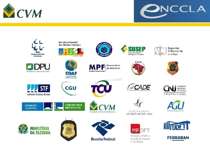 Executivo Federal: ABIN, AGU, Casa Civil, Banco Central, CADE, CGU, COAF, CVM, DPF, INSS, MRE - Itamaraty, Ministério do Planejamento, PGFN, Receita Federal, SUSEP, PREVIC, etc. Executivo Estadual: CGA/SP, CGE/MG, Governo do Estado do RS, Polícias Civis (SC e SP), GAECO, etc. Executivo Municipal: CGM/SP Conselho Nacional de Justiça MPF, CNMP, MPs Estaduais