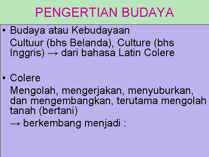 PENGERTIAN BUDAYA • Budaya atau Kebudayaan Cultuur (bhs Belanda), Culture (bhs Inggris) → dari bahasa Latin Colere • Colere Mengolah, mengerjakan, menyuburkan, dan mengembangkan, terutama mengolah tanah (bertani) → berkembang menjadi :
