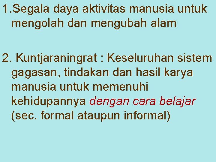 1. Segala daya aktivitas manusia untuk mengolah dan mengubah alam 2. Kuntjaraningrat : Keseluruhan sistem gagasan, tindakan dan hasil karya manusia untuk memenuhi kehidupannya dengan cara belajar (sec. formal ataupun informal)
